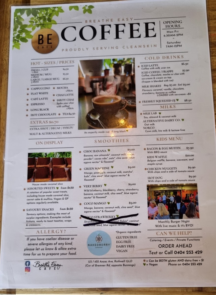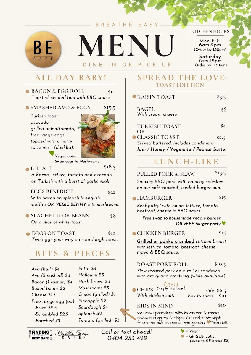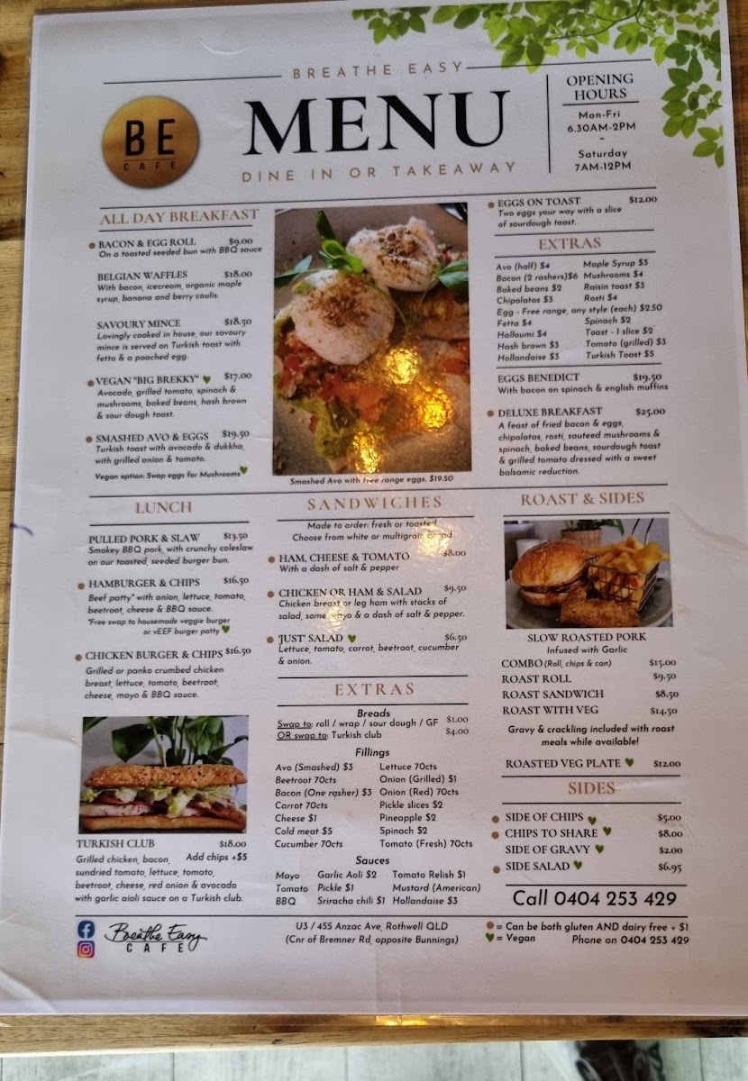 Welcome to Breathe Easy Cafe, your go-to spot nestled in Rothwell, Queensland. This vibrant cafe is more than just a coffee shop; it's a breakfast haven where the community gathers. The menu, available until 1:30 PM, boasts an array of delightful breakfast options that cater to every palate.